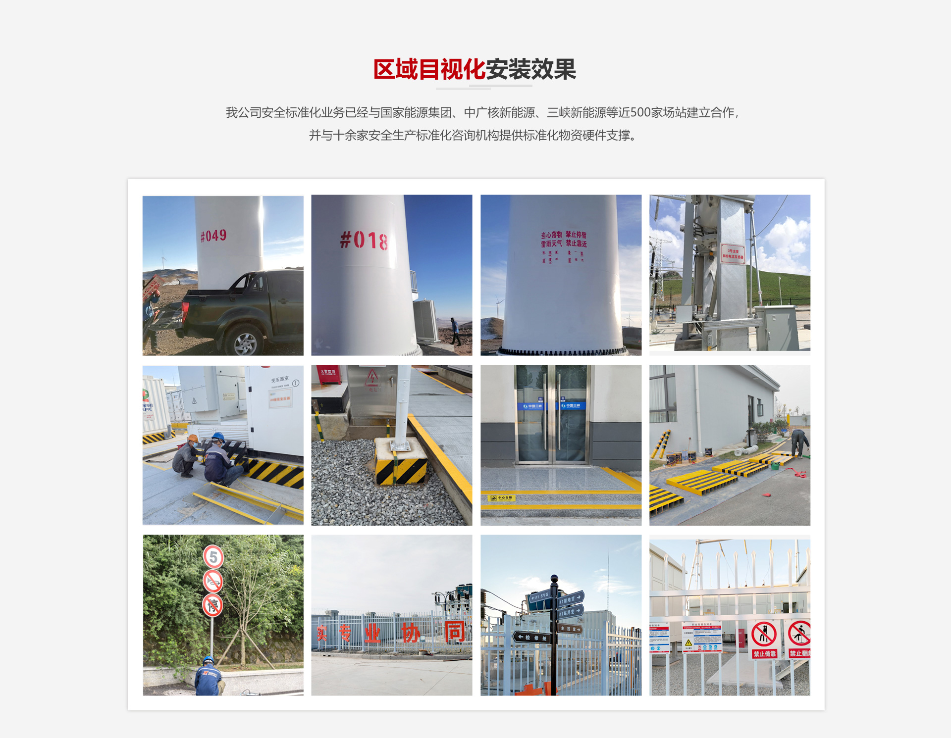 我公司安全標(biāo)準(zhǔn)化業(yè)務(wù)已經(jīng)與國(guó)家能源集團(tuán)、中廣核新能源、三峽新能源等近500家場(chǎng)站建立合作,并與十余家安全生產(chǎn)標(biāo)準(zhǔn)化咨詢機(jī)構(gòu)提供標(biāo)準(zhǔn)化物資硬件支撐。
