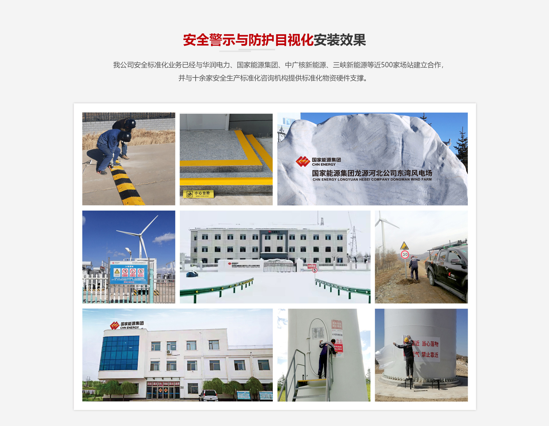 我公司安全標(biāo)準(zhǔn)化業(yè)務(wù)已經(jīng)與國家能源集團(tuán)、中廣核新能源、三峽新能源等近500家場站建立合作,并與十余家安全生產(chǎn)標(biāo)準(zhǔn)化咨詢機(jī)構(gòu)提供標(biāo)準(zhǔn)化物資硬件支撐。