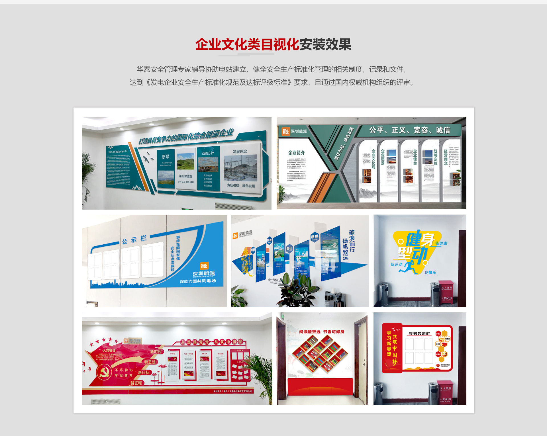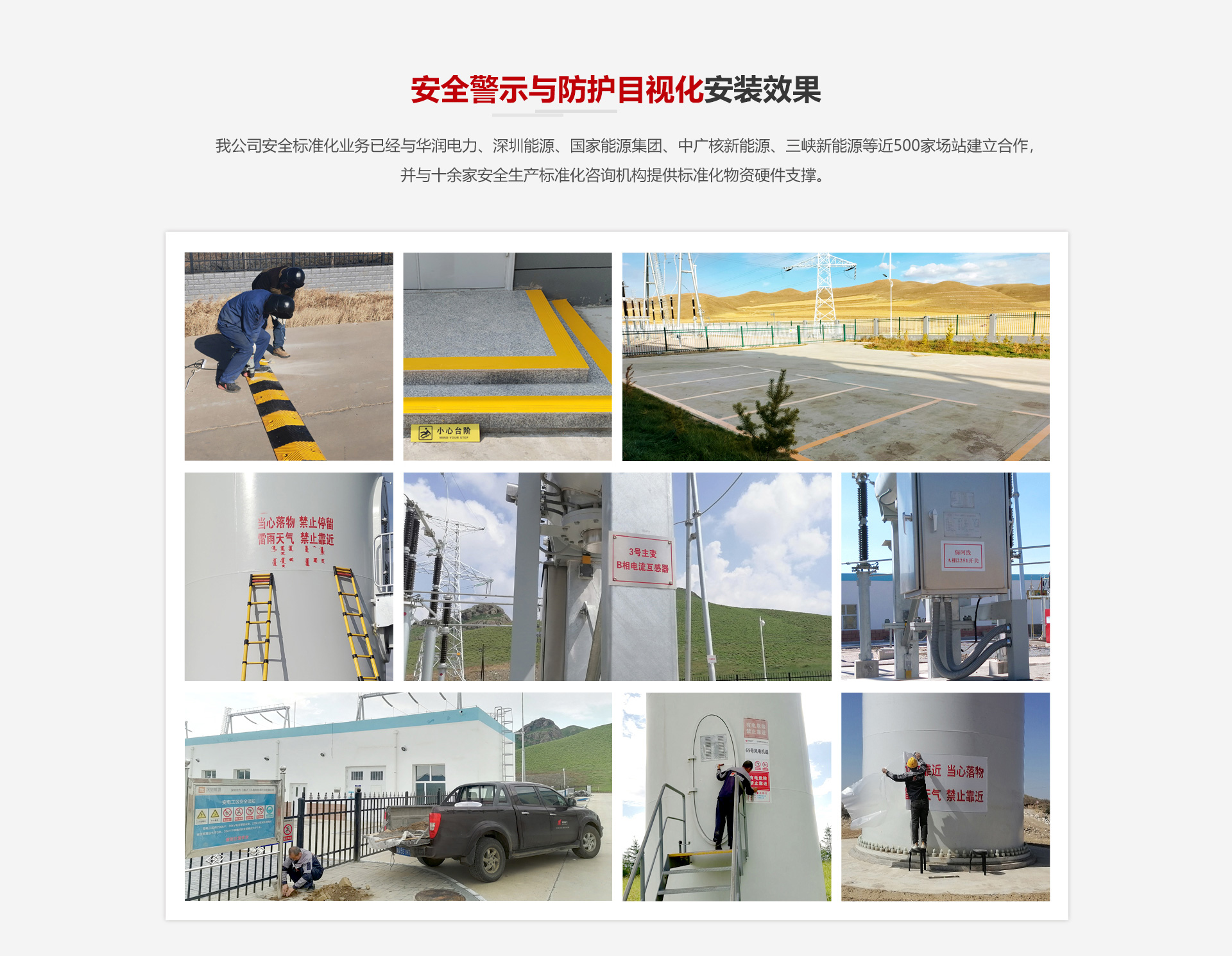 我公司安全標(biāo)準(zhǔn)化業(yè)務(wù)已經(jīng)與國家能源集團(tuán)、中廣核新能源、三峽新能源等近500家場站建立合作,并與十余家安全生產(chǎn)標(biāo)準(zhǔn)化咨詢機(jī)構(gòu)提供標(biāo)準(zhǔn)化物資硬件支撐。