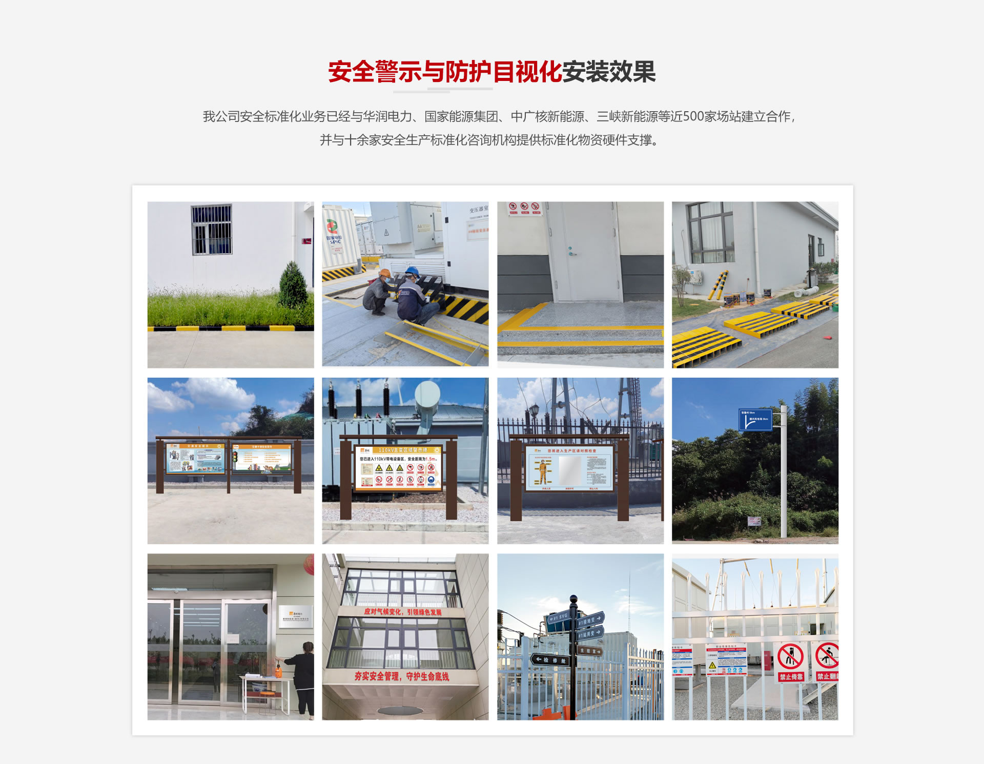 我公司安全標準化業(yè)務已經(jīng)與國家能源集團、中廣核新能源、三峽新能源等近500家場站建立合作,并與十余家安全生產(chǎn)標準化咨詢機構提供標準化物資硬件支撐。