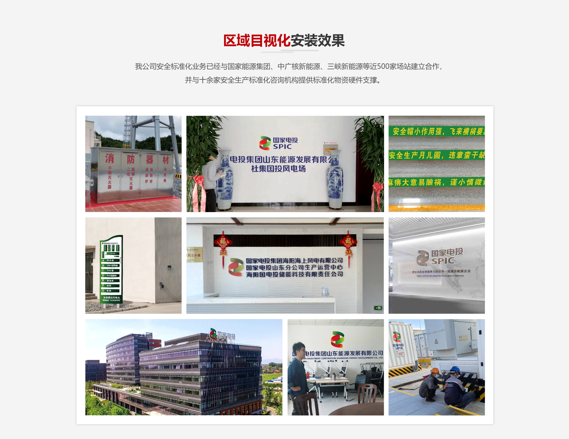 我公司安全標(biāo)準(zhǔn)化業(yè)務(wù)已經(jīng)與國家能源集團(tuán)、中廣核新能源、三峽新能源等近500家場站建立合作,并與十余家安全生產(chǎn)標(biāo)準(zhǔn)化咨詢機(jī)構(gòu)提供標(biāo)準(zhǔn)化物資硬件支撐。